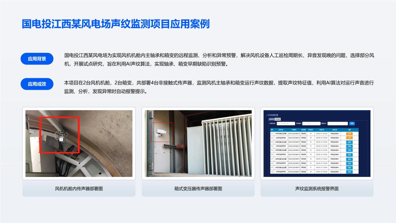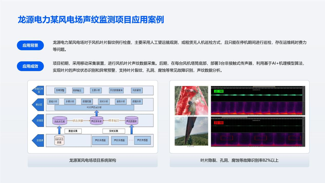 ·(2) 全自动闭环管理:采用三级告警阈值(P90/P95/P99) 设计,系统发现异常声纹(含人耳无法听到的超声信号)自动触发报警,辅助运维人员进行复核与工单处理,替代传统高成本的人工与无人机巡检。